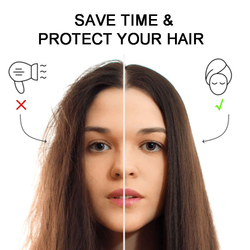 Szuperül felszívja a vizet, gyorsan szárít, időt takarít meg és 100%-ban természetes módon szárítja a hajat! Nincs többé szüksége elektromos hajszárítóra! Csökkenti a töredezett hajvégek, a szárazság, a göndörség és a sérülés kockázatát.