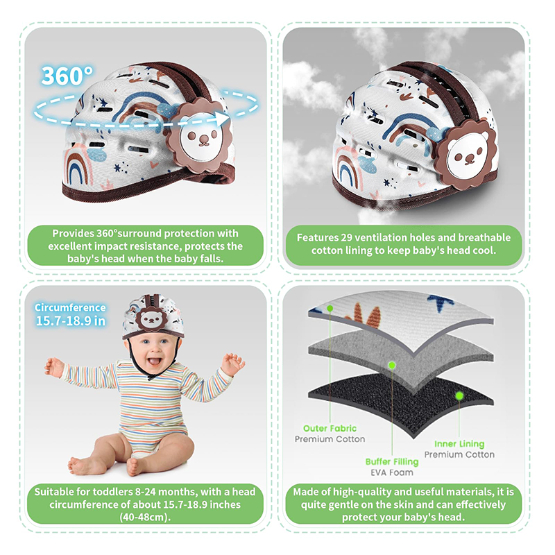 360°-OS FEJVÉDELEM A BIZTONSÁGOSABB LÉPÉSEKÉRT – Ez a sisak teljes 360°-os fejvédelmet nyújt, elnyeli az esések okozta ütéseket, megelőzve a dudorokat és zúzódásokat. A ütéscsillapító kialakítás növeli a baba önbizalmát a járás tanulása során, minimalizálva a fejsérülések kockázatát.