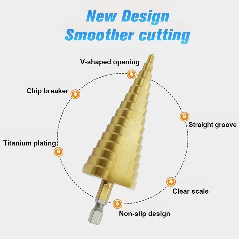 Új fúrótechnológia: HSS acél + titán bevonat – nagyobb hatékonyság és hosszabb élettartam. A High Step kialakítás lehetővé teszi a pontos megállást, így elkerülhető a túl nagy furatok véletlen készítése.