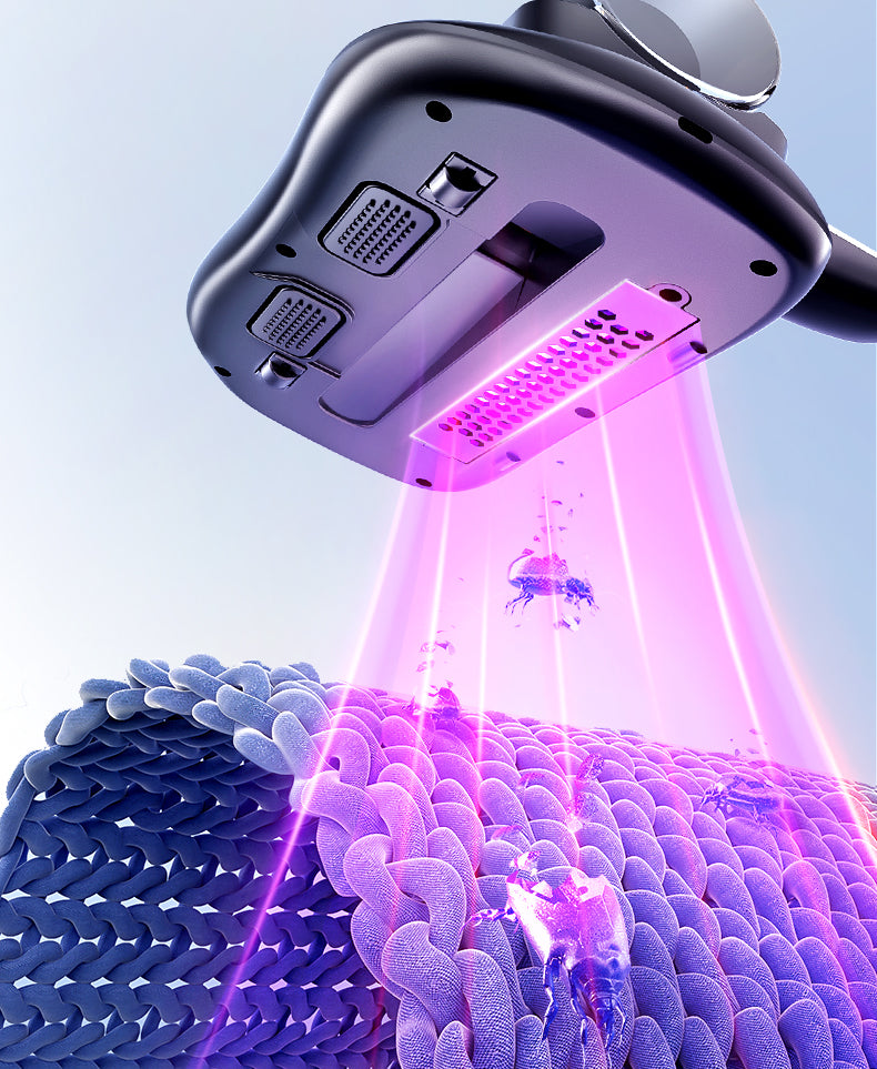 DUAL-ACTION UV-STERILIZÁCIÓS RENDSZER - A 254 nm hullámhosszú UV-fény áthatol a matrac rétegein, hogy elpusztítsa a baktériumok és atkák sejtes szerkezetét, 99%-os sterilizálási arányt elérve. A 90%-os atkaeltávolítási hatékonysággal kombinálva ez a kettős hatású rendszer hipoallergén alvási környezetet teremt - tökéletes óvodások és allergiások számára.