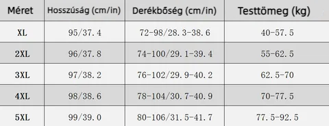 - Méretek: XL,2XL,3XL,4XL,5XL