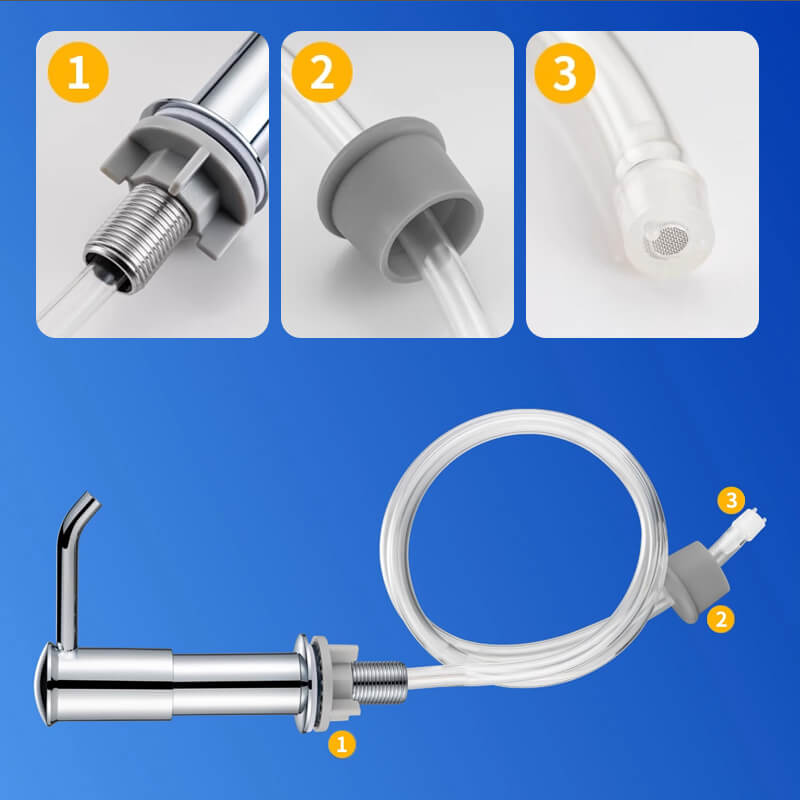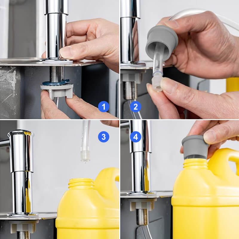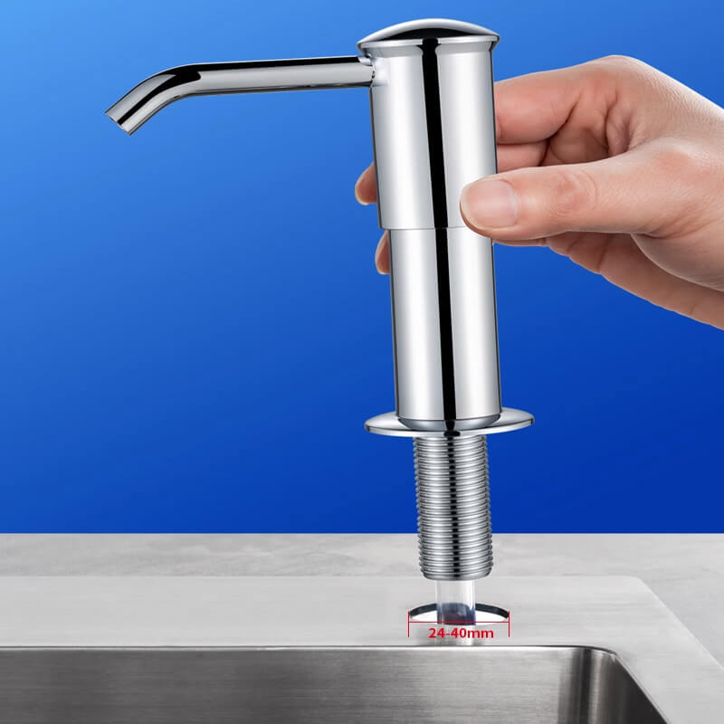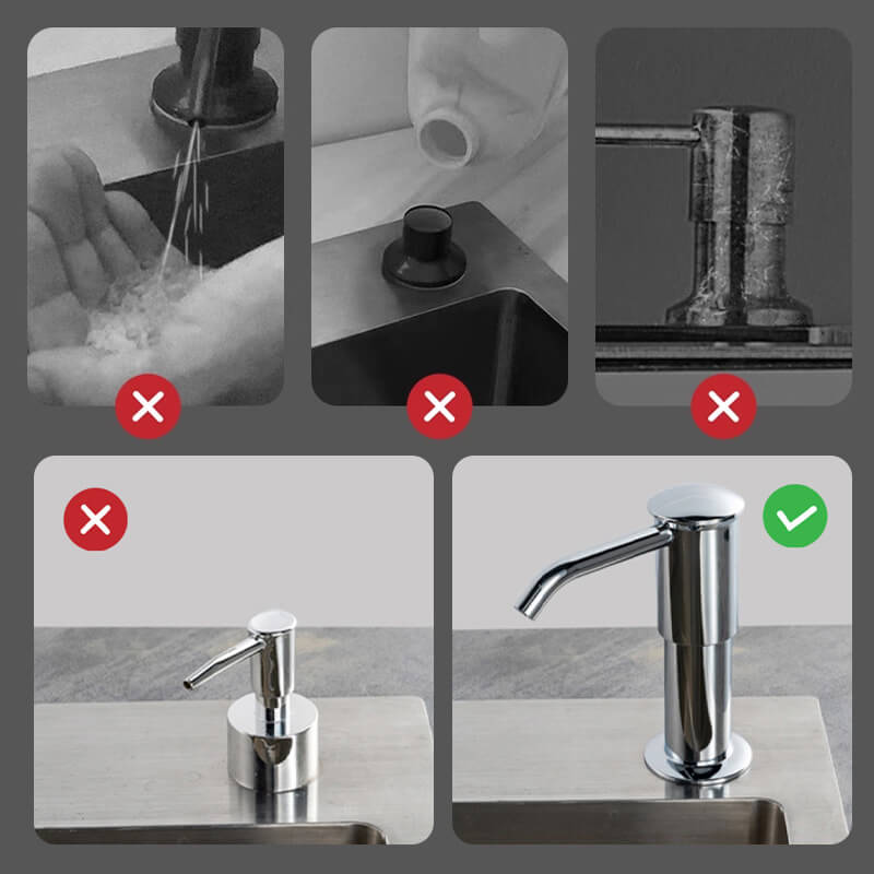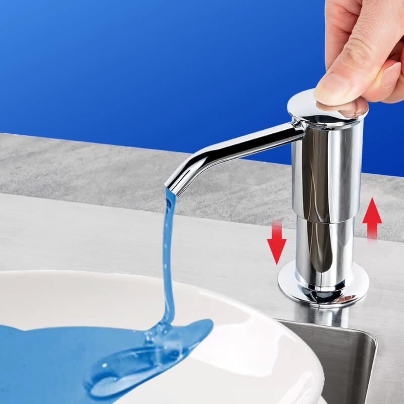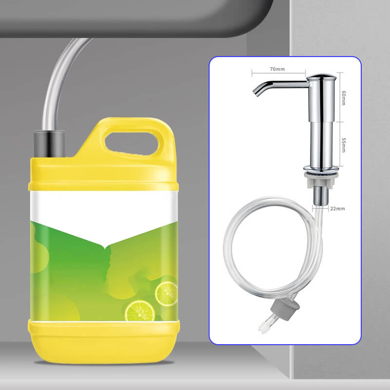 Beépített szappanadagolónkat néhány perc alatt bármilyen típusú konyhai mosogatóra vagy munkalapra felszerelheti. (Bármilyen anyagra, például gránitra, rozsdamentes acélra, fára felszerelhető ). A hosszú tömlővel kihagyja a kereskedelmi szappanadagoló újratöltésének rendetlen folyamatát.