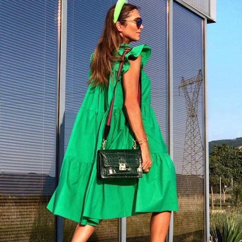 VERSATILIS STĂLUS: IdeĂĄlis a villĂĄsreggelihez, kerti partikhoz vagy nyaralĂĄsokhoz, ez a ruha könnyedĂ©n pĂĄrosĂthatĂł lapos cipĆvel, szandĂĄllal vagy magassarkĂșval. Csiszolt, elegĂĄns megjelenĂ©sĂ©rt egĂ©szĂtse ki egy kĂ©zitĂĄskĂĄval.