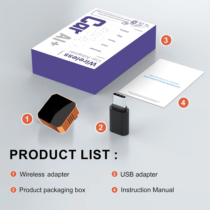 A csomag tartalma: 1 * 2 az 1-ben vezeték nélküli adapter iPhone és Android Auto készülékekhez