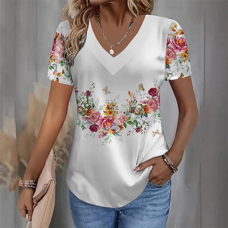 Női virágos nyomtatott V-nyakú rövid ujjú felső